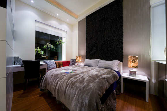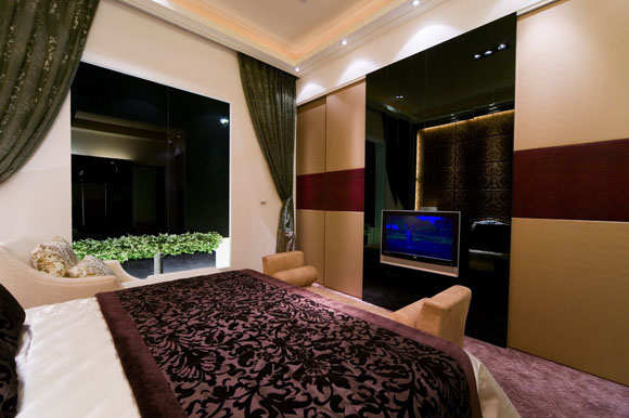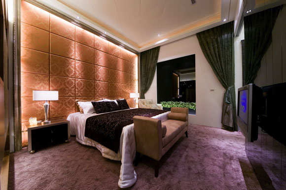 主卧将更衣与睡铺空间独立开来,床头采用大面积的绷布,利用华丽的花纹色调,铺排浪漫的紫色与暖橘,辅佐间接光源,将色彩跳跃于空间中,床尾电视墙面利用黑色镜面材质延伸视觉,两侧利用皮革营造质感,内侧为进入更衣、卫浴空间之拉门。