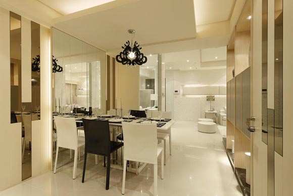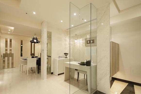 餐厅部分以茶镜、玻璃等反射材质,搭配木作作壁面或进入厨房区域及其他私密空间的隐藏门扉做ㄇ字型设计,具视觉延伸及放大空间的效果。透过黑色的水晶吊灯灯饰、间接光源,利落的安排出餐叙区域光影层次丰富的空间旨趣。书房系利用玄关的转折区域安排出阅读及延伸的空间感,全区以清浅的米色安排,延续公共空间的彩度基调。