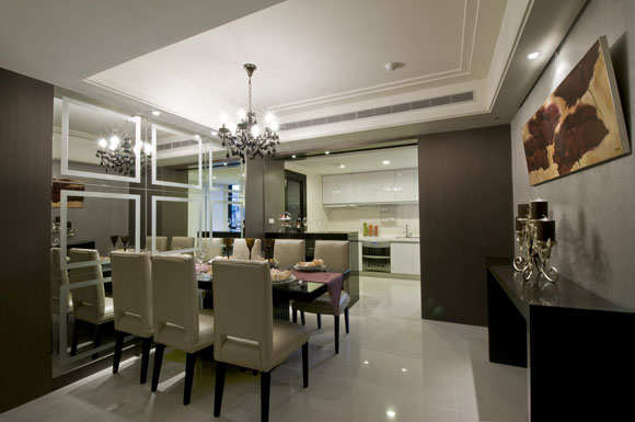 进到开放的餐厨共享空间,六人坐的长形餐桌置于九宫格切割线条明镜前,放大室内空间感,张静峰设计师继续挥洒矩形艺术于明镜墙面上,以白色粗边框的矩形将虚化的切割线条化为实质的边框艺术,更丰富了用餐空间的活泼氛围。
