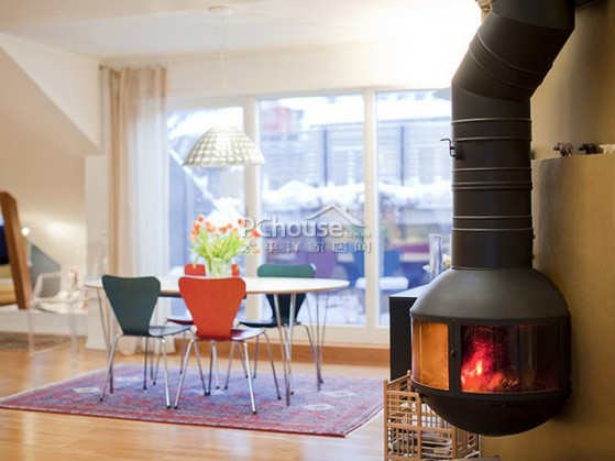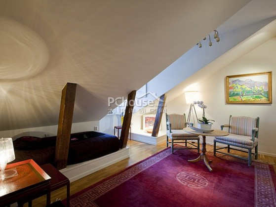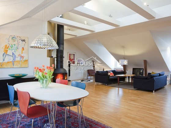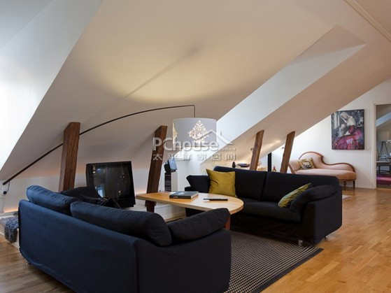 木材横梁看起来十分的现代,就像如今的流行趋势一样。另外,古老质感的壁炉和倾斜的墙壁都为公寓的独一无二和温暖增色不少,使公寓真正地呈现出优雅的姿态。