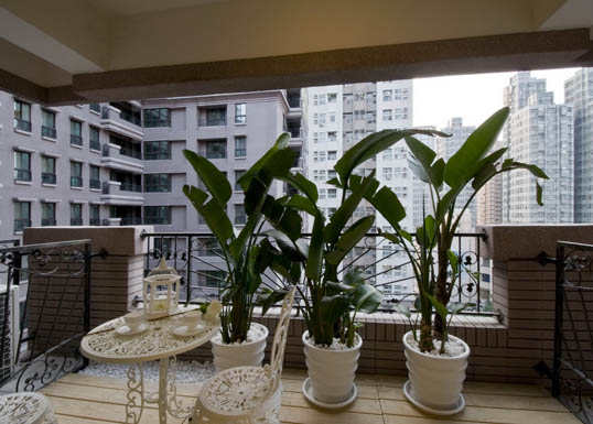 阳台上,古典造型桌椅让人有了想来份英式下午茶的冲动,而纳入了排水实用性,架高的木作地板,提点出休闲却又隐密的场域。