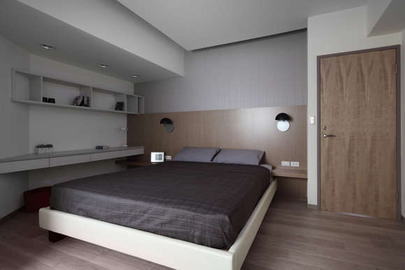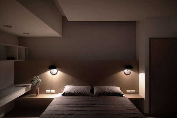 在床头上方铺排一层木板,床头处加一层隔板,安放随手物品,但由于不是柜体设计,所以没有占到太多空间,不会造成视觉紧促,在床头灯的配合下,颇具整体感,不过这对材质和装修要求高些,虽然适合小户型,但预算要把握好。