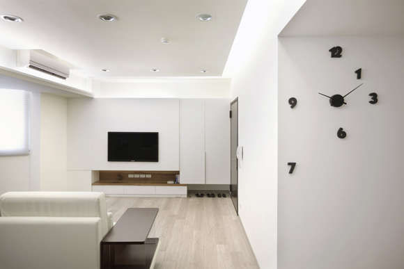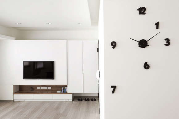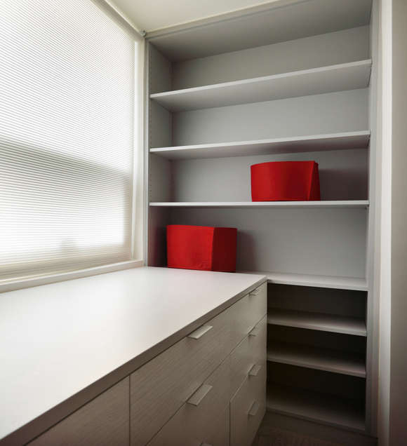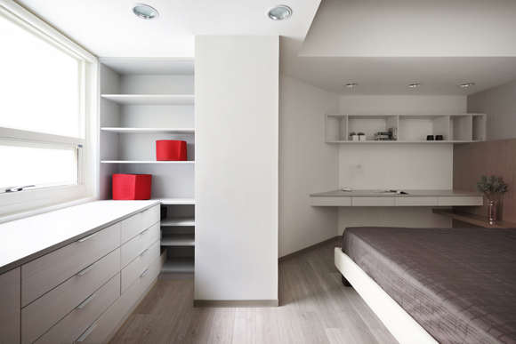 修正了公共空间的横梁线条,真正的难度却是在于主卧室场域。横梁下的畸零空间,禾筑设计顺着外推窗的角度,巧妙转化为梳妆台的设计位置,而位于三分之ㄧ卧房空间的大型柱体,在设计师巧思规划后,成为后方五斗衣柜更衣区与前方卧眠区的空间分野,更衣区梁下的空间刚好成为屋主收藏名牌包包的展示空间,大型柱体分野空间的机能,在对向压克力灯箱的衬托下,反倒成了整体空间里不可或缺的对称要角。