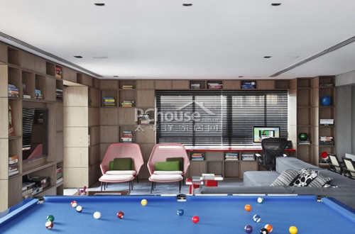台球桌是一个客户的要求,希望每星期他的朋友们过来玩的时候,可以随意的喝一点。颜色也是应客户要求漆成蓝色,地毯选用灰色。