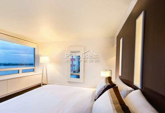 镶嵌着三个垂直玻璃窗的墙面用来分隔主卧的浴室和睡觉的地方,浴室的窗户还能为人们提供超棒的比斯坎港湾的景色。卧室里,可以安置定制的床头。