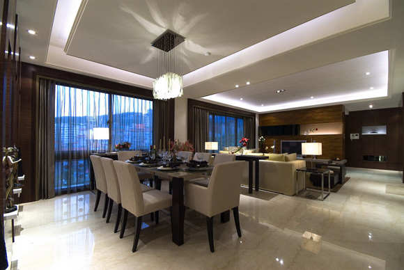 重视端景安排的设计师张静峰,特别将餐厅背墙规划四座类似中式挂画的摆设柜,木制的深色框格,让收藏品的摆放更有趣味。无障碍与不受阻隔的开放视觉感,延伸客餐厅,与大片开放的落地窗景观,无限的宽敞度让生活更悠适。