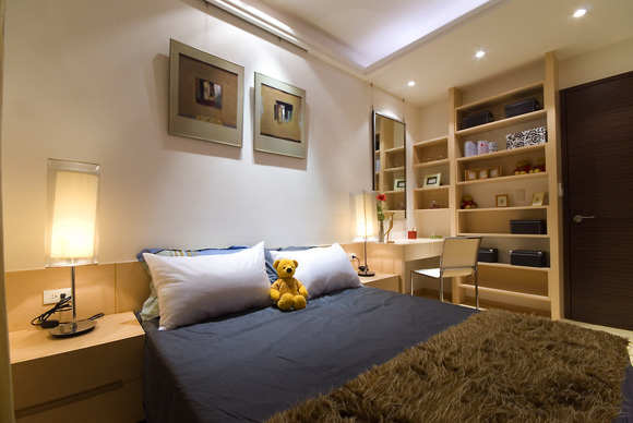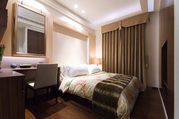 卧室采用立面线条干净的方式,稳定睡眠情绪。主卧床头壁面利用绷布造型,呈现纯粹干净的视觉,窗边设定休憩起居空间,梯型的窗户搭配颇具浪漫感的丝质窗帘,主人可在长椅上闲适的躺卧,主卧睡铺以橄榄绿及浅紫色调呈现温婉典雅的舒适感,通往主卧卫浴过道处设定梳妆更衣间,让睡眠与盥洗能各自独立不受干扰。