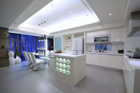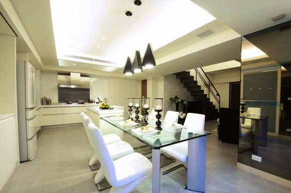 移步餐厅,视觉焦点落于晶莹剔透的圆形发光体,中岛吧台占去的深度,设计师善加利用,变化为前卫的展示酒柜,与厚玻璃高低交错,延伸出大餐桌。