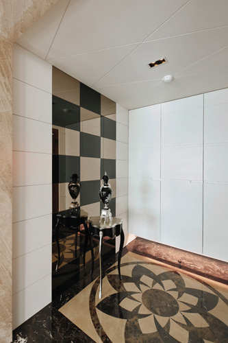 一进门的玄关区拥有独立场域,正对大门以黑镜、茶镜双重光面材,诠释经典棋盘印象并搭配端景几与艺术品来汇聚视觉焦点,入口处必要的收纳机能,则集中于右侧质感轻盈、线条极简的白色高柜内,上方天顶细腻的菱格纹线条勾缝,避面过多装饰造成视觉的压迫,同时平衡地面工序繁复的双色石材拼花,营造大器优雅的第一印象。