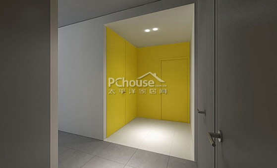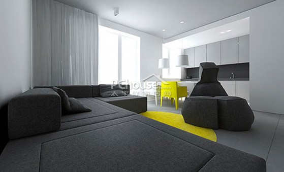 整个室内的墙壁都被漆上不同的色彩,从亮灰色到暗灰色,设计师又再添加上黑、白和黄色三种颜色的家具和门,从而创造了一种高尚的品位和优雅的氛围。