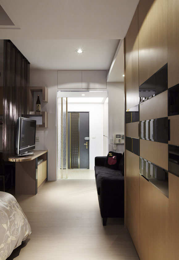 进入室内,设计师林洋以架高的地面,划分出室内外空间感,门斗上方与天花板降下的层板,暗藏着贴心的收纳柜,选以金色壁纸铺陈的深色沙发背墙,带出低调的华丽,另外为了让小夫妻无论身处于屋内任意角落,皆可以放松身心观赏电视,设计师林洋在电视座上加入旋转盘,营造出三百六十度的可能。