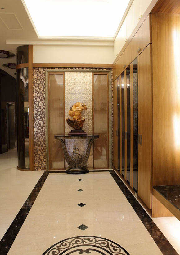 从大门看起,圆形具有圆满象征意义的图腾和天花线板造型相互呼应,电视主墙采用三段式的不同材质混搭,黑金锋大理石及咖啡色中国窗型图案的皮革,铺述出大气质感,左右横拉用壁纸和罗马帘将窗户隐藏其中。