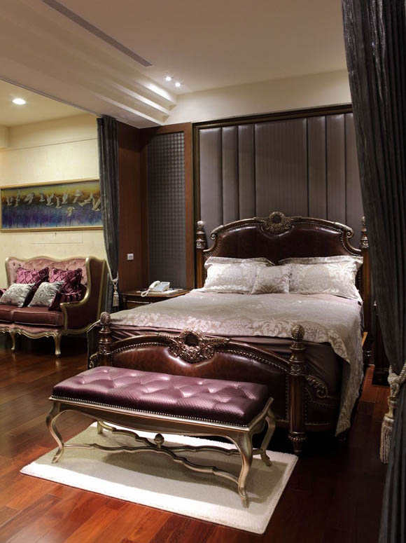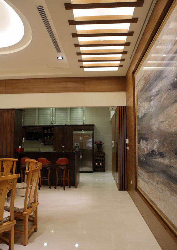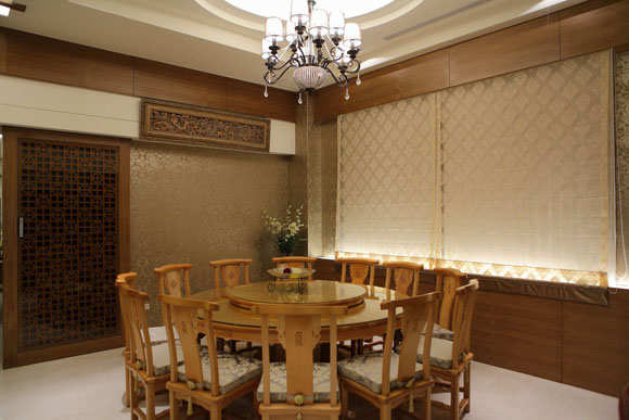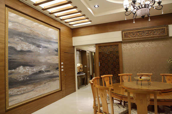 餐厅以金色为主色调,壁纸和窗帘皆以金色铺陈,中式的大型桧木圆餐桌和餐椅展现大家族的气势,在坐垫部分则运用女主人喜好的古典样式。特别耀眼的是这面大理石,自然的纹路呈现出磅礡的抽象山水画,值得驻足细细欣赏。厨房区域亦是挑选原木的厨具作搭配,并以中式窗花的雕刻板搭起拉门,可视使用需求与空间作区隔。