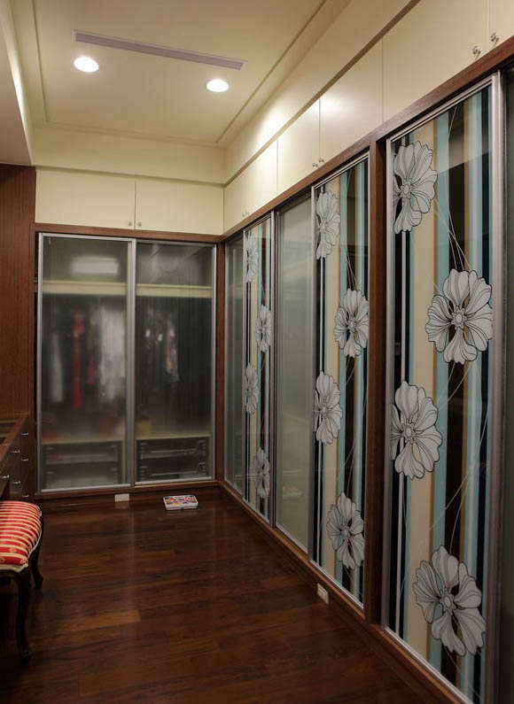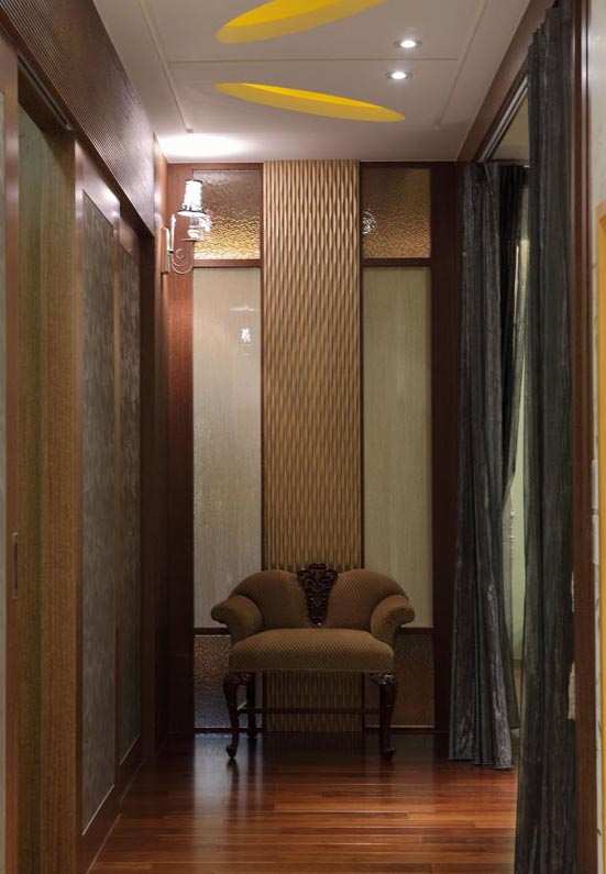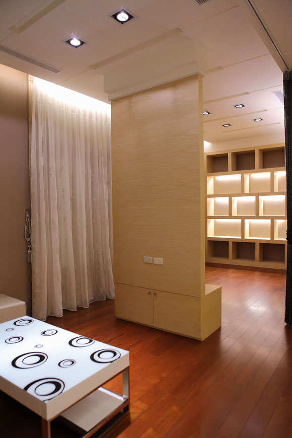 精选的沙发家具换了三次,才找到真正符合的造型款式。客厅一旁是男主人喜爱的泡茶区,柚木和金丝的夹纱玻璃极具协调性及穿透感,围塑出古色古香的迷人气息,将屋主珍藏的茶壶陈列于造型层板上,突显屋主个性品味。