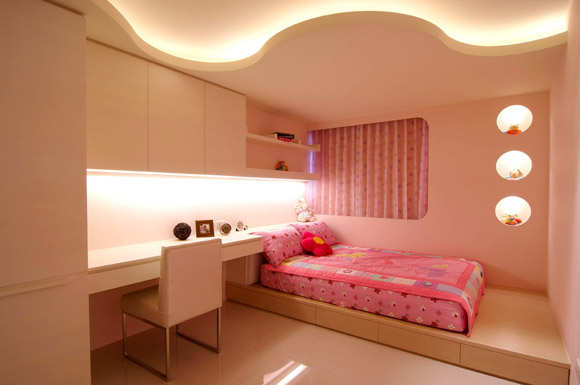 由于小女儿还在读幼儿园,所以在设计上将小女生活泼的感觉利用线条、颜色勾勒出来。用曲线、圆形来突显儿童房的趣味性,窗户的设计也以弧度的转角来修饰。