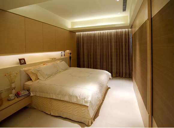 这是一个完全整体设计的卧室,比较狭长,最主要的家具就是床和整体床头柜,一眼望去,干净利落,整洁和谐。柜体厚度需要和天花横梁平和过渡,也省去了处理横梁的烦恼。