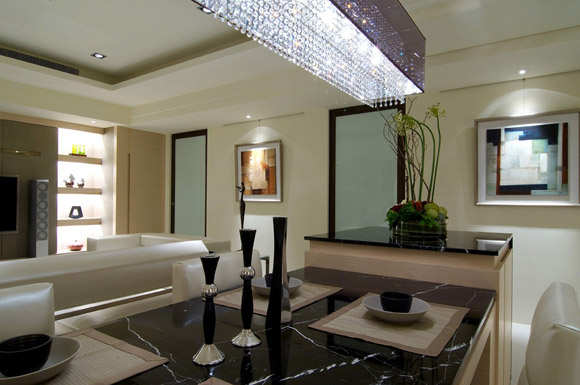 无走道的设计会让每个区域都被使用到,比原始的客餐厅的格局还多了13平米空间。于餐厅的水晶灯外面加上一层薄膜设计,减缓了视觉上的锐利效果,整体营造出低调而优雅华丽的气氛。