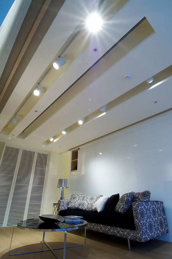 为了掩去建筑体的梁柱,客厅天花设计借由凹凸造型、搭配间接光源,形成光影层次感的错落旨趣。