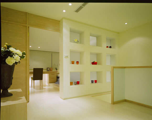 楼上书房区域,以玻璃做背景,九宫格的木作造型方式成为书房与梯间的接口,其中可展示、收纳屋主的收藏对象,具透光效果,同时成为楼上的端景效果。