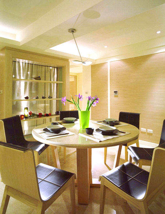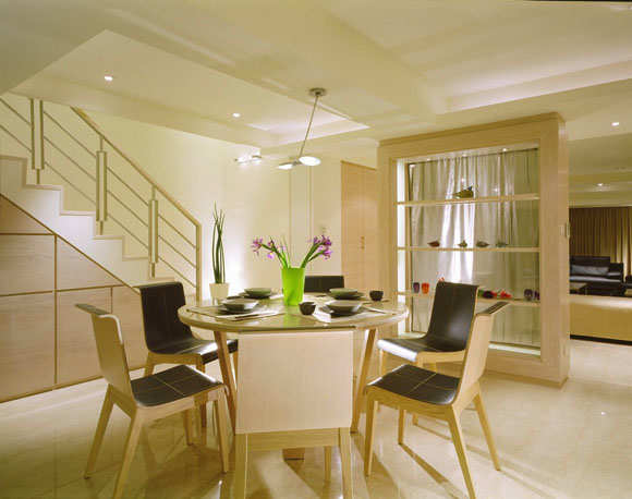 为了不让餐叙区域的天花过低,保留原始梁柱,使之成为装置设计的部分,造型单纯的灯饰,妆点出餐叙时需要的宁静优雅氛围。
