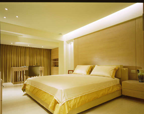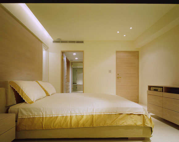 主卧主墙以木作单纯的线条做背景墙的修饰,塑造一室清雅、敞明的卧眠氛围。卧眠区域的更衣室、卫浴空间的接口设计比例及造型,与进出的门扉做同款的规划,形成对称的空间旨趣。卫浴以清玻璃为接口,将干湿区域分离规划,明镜的安排,加深及延展了空间感。
