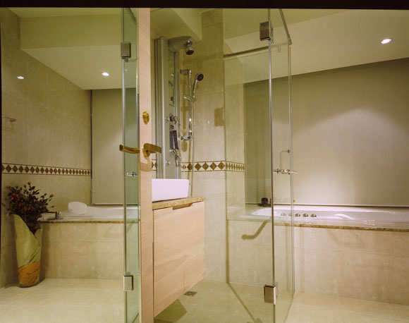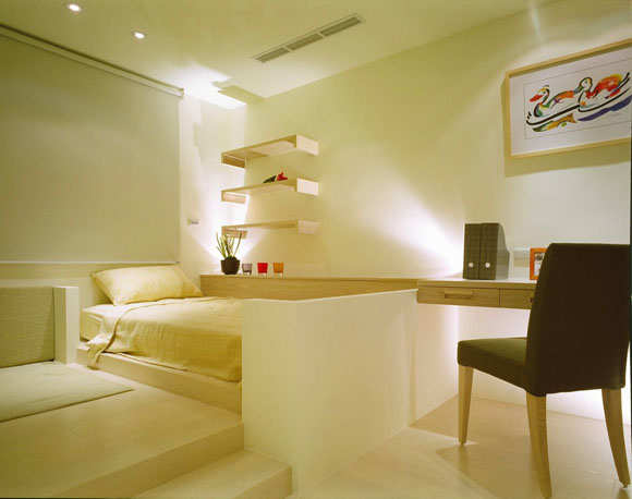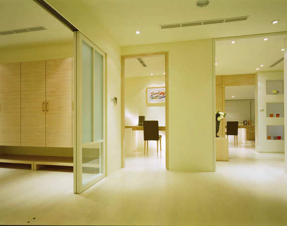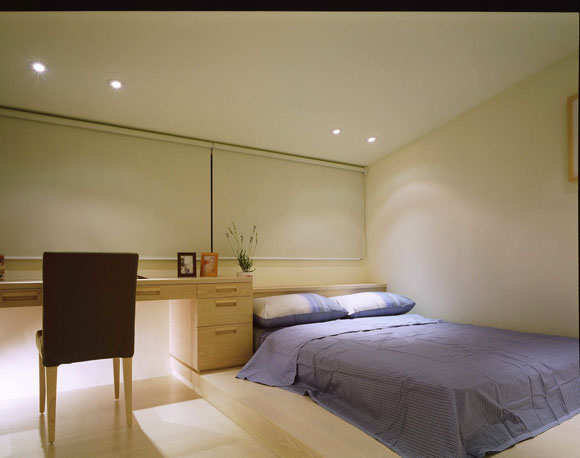 从梯间转折进入私密区域为卧眠区及和室,和室推拉门扉以喷砂搭配清玻为主,开阖之间,具透光效果及开阔的空间表现。