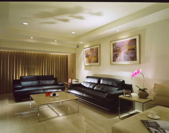 客厅区域以黑色的沙发组配置间接光源、金属框架的桌几,营造空间现代的时尚质感。