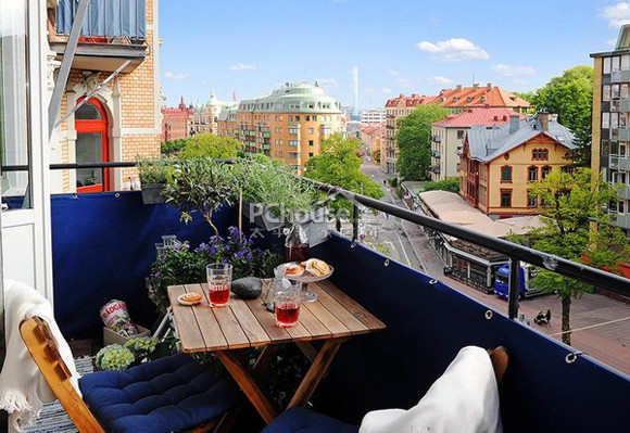 可爱的阳台上摆放着一张三人座的木制桌子,桌子的位置恰巧就位于客厅的旁边,成为了一个吃早餐的绝佳场所。