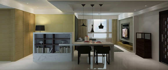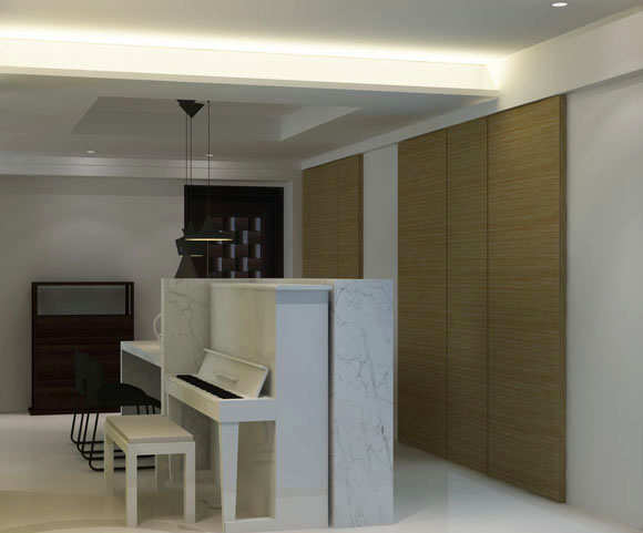 值得一提的是设计师依据钢琴的大小以大理石打造一座半墙,背面则设计为书柜,也同时结合餐桌的设置,女主人不用再窝在小房间里独自弹琴,在这里可以随性地做音乐的演奏;男主人则可以在此阅读,两人一起于此共同分享彼此的兴趣,也省去另外设置琴房与书房的空间。