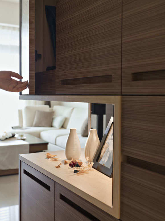 架高四十公分的和室下方九宫格,中间是和室桌,前三格运用走道空间作抽屉收纳,后面五格则是上掀置物,侧边展示柜可以放上收藏的物品,在灯光衬托上更显珍贵。门片采上吊轨方式安装,地板少了轨道更方便清理,上方和下方的畸零空间一样也不浪费充分的运用。