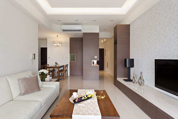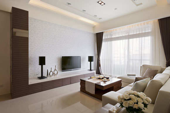 客厅电视墙简洁大方、没有多余的累赘装饰,仅以淡雅的壁纸整面铺陈,暖色调大理石台面的矮柜满足视听设备的安装,搭配柚木家具让质感更提升。