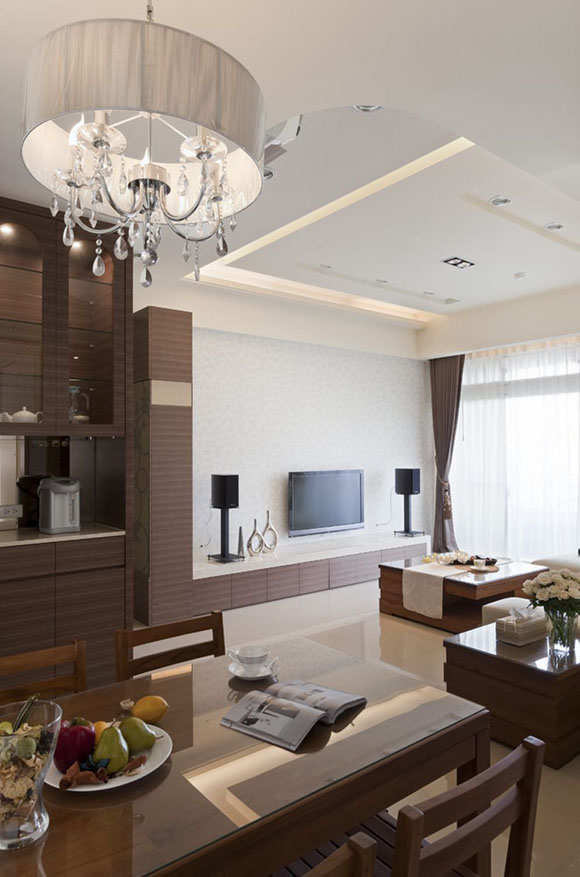 厨房门片以延续双面柜木皮加以运用,餐厅挂上一盏浪漫华丽的吊灯,塑造出温馨的用餐气氛。