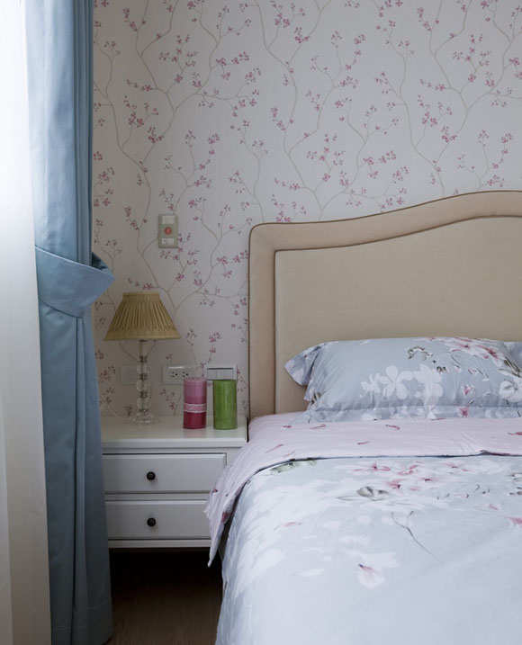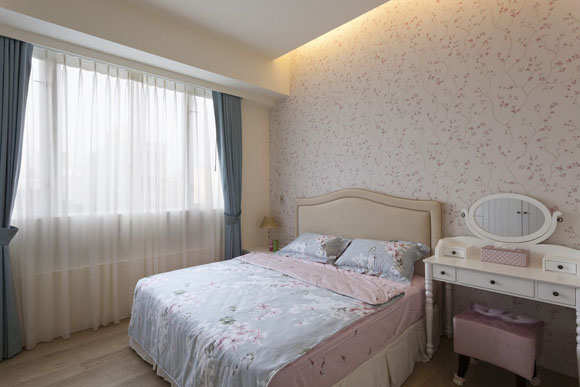 主卧运用碎花壁纸铺述出优雅的舒压环境;一整排的衣柜用白色烤漆抓沟缝处理,营造美式乡村的淡雅浪漫氛围,电视柜采取饭店式门片可折迭侧收方式,整齐又美观。