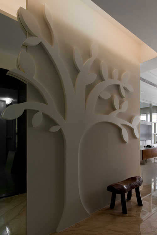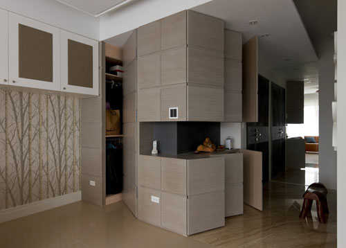 欲在100多平米的空间裡规划3+1房,并拥有强大的收纳机能,完全就是考验设计师的功力。玄关的收纳鞋柜以上下柜方式呈现,中间留白的平台设计去化柜体的量感,呼应大树造型的立体方格木质柜门,向内转折进入客厅场域,延伸的线条直抵客厅底墙,串连起两个场域之外,还将拥有超大收纳容量的储藏室藏身在一体成形的木质门片后方。而沙发背墙处的横梁下方是设计师收纳客厅什物的绝佳选择,沿墙面而设的上吊柜以白色烤漆为底,中间再跳以灰色绷布软化冷硬的柜体线条,下方的玻璃柜体开放设计,让屋主的收藏珍品有完善的展示空间。