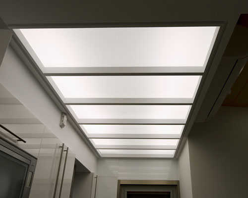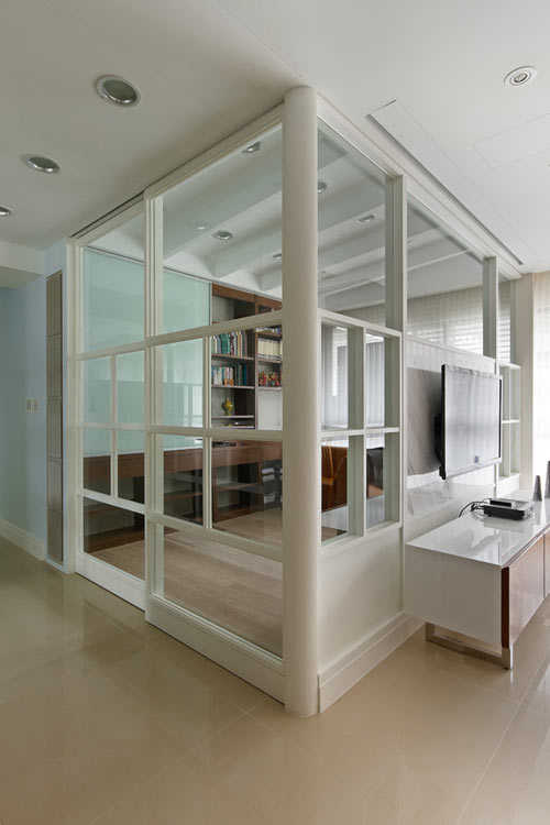 位于电视墙后方的书房原来是餐厅的预留位置,在设计师调整过场域动线后,以清玻璃围塑出清朗穿透的日光书房,大容量的书房以置顶的斜面书柜打造出诚品书局的阅读氛围,而置于窗边的工作桌及卧榻,更是设计师让屋主一家人感情增温的贴心设计。因应书房的增设而调整过得餐厨空间,设计师利用后方玄关内缩预留的位置,作为冰箱等大型厨房设备的空间,一字型的厨具设备就足以使用,还多了中岛吧台的机能性配置。