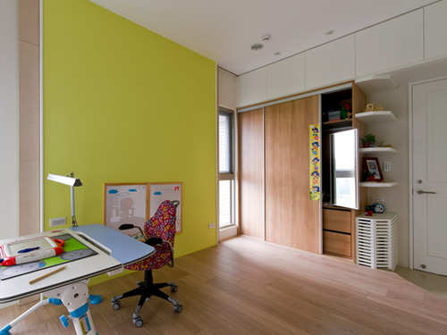 除了依照屋主需求全屋以环保建材打造外,在动线、收纳完善之余,屋主还希望营造出高彩度的温馨居宅。鲜橙色与天空蓝的座椅配置,丰富了以半木色为基底的客厅场域氛围,顺着水蓝色廊道入内进入小孩房,亮眼的黄绿色凝聚了目光焦点,黄绿相间的全布窗帘从天花悬垂置底,在一片浅白木色中,再缀以色彩鲜明的红、蓝儿童座椅,弹性使用的儿童空间藉由色系的变化,充满了跳跃的氛围。