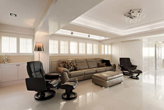 【太平洋家居网 设计频道】除去原本开门见山的水池造景,设立隔屏让直入而上的楼梯转向,同时也虚化顶上横樑,并获得一处宽阔明亮的进场玄关,使踏入室内的心情有豁然开朗的惊喜感,而一旁神明桌与展示柜的结合让信仰不与空间衝突。设计师依据屋主喜爱的白色的雅緻打造雪白银狐的电视主墙接连,一路延伸至餐厅场域,让原本60多平米的空间具有放大的效果。