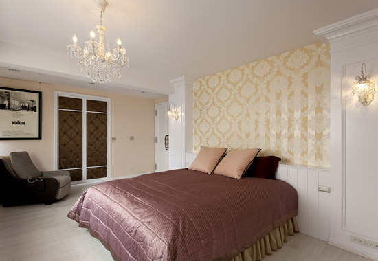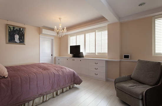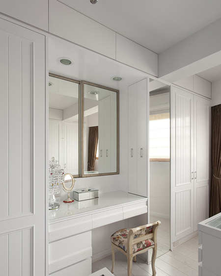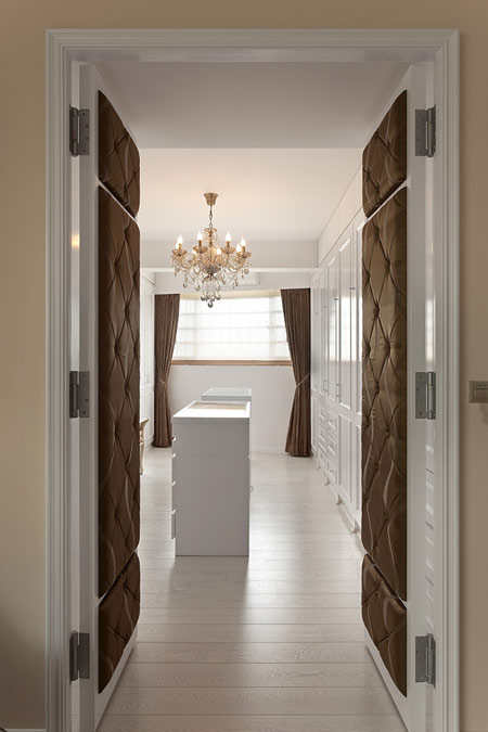 更令人惊艳的莫过于主卧房了,双开门说明了主卧的宽阔气势,优雅壁灯与水晶吊灯相辉映,铺排睡眠场域的浪漫华丽。聪明的电动升降电视满足空间机能,也使空间设计感更为完整。更衣间对开的绷布门面的气派华美,与量身打造的精品展示柜更是完美呈现女主人对饰品收纳的想望。