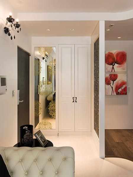 欲前往叁楼主卧的梯间则利用墙面的线板造型将结构樑柱化解掉,同时成为壁面的装饰,而为了化解电箱的位置,以象徵主卧家徽的设计来化解,成为进入主卧前的第一印象。
