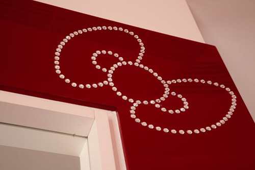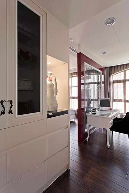主卧床头背墙以桃红搭配金色的壁纸为主,床头部分将Hello Kitty的蝴蝶结造型、搭配镶金箔的边框设计,透过材质的搭配,将Hello Kitty的可爱、Anna Sui的品牌精神完整的融入。与书房间的屏风介面,一样看得到Hello Kitty的image。半穿透的造型屏风以雷射切割花纹为图腾、木作搭配钢烤为边框设计,同时成为卧眠区域、书房、更衣室叁者间的介面。大面积的衣柜部分係使用静音上吊式轨道设计,使门片在推拉的同时十分静悄。女主人梳化区以大理石做檯面设计,柜体部分设计师贴心的以烤漆玻璃安排,为免粉渍染黄常触碰的地方。一旁欲进入卫浴空间的门扉以雷射雕刻切割出花卉图腾,维持隐约的通透感却又保有隐匿的效果。一旁的收纳柜多达12格格柜的设计,方便主人使用,精品柜的设计也免去灯光可能造成皮件变硬或泛黄的可能而略去。