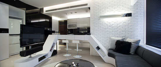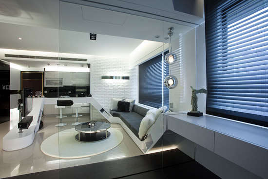 将儿子纳入未来的生活伙伴,是屋主的期望。三十米厘的压克力加以LED嵌灯照明,开灯瞬间落地压克力呈现光体般炫目质感,前卫的让人震撼,细节中看见卧房与客厅衔接处预留的沟缝,以及天花板上自动滚动条十二公分细薄收缝,当然,不透光卷轴放下时便成为孩子的私密天地。