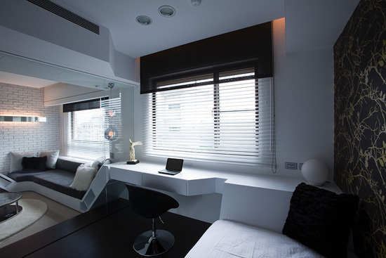 太平洋家居网 设计频道非黑即白的利落,从玄关与黑色烤漆玻璃带出的腰线起始,延伸上卫浴门片,大片黑烤玻的隐藏设计进化着质感,和鞋柜交相对称的电器柜,整合出了小户型的细腻。色彩运用精彩外,采以悬空设计的鞋柜,下方更以格栅设计,细心保留了通风机能,加以间接光源轻盈视觉。