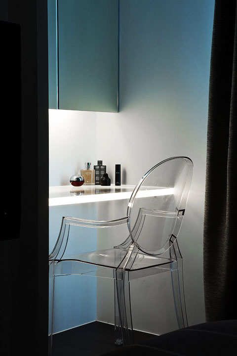沿续着白,床架与书桌接轨处,刻意预留的凹处让起床者,不会有「敲头」的危险,大片壁纸的跳色处理,让空间聚焦而不单调。呼应着这份压克力发光体的时尚,主卧化妆台同样以此收边,演绎出展列意象。