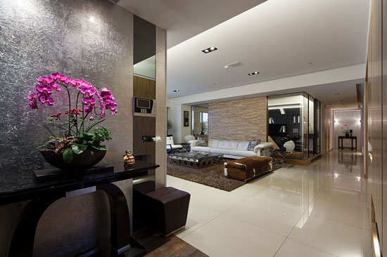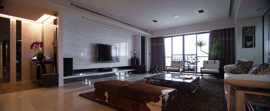 大坪数的场域中,设计师只将客厅与书房间的隔间墙,从厚实的水泥墙面,改成清朗的玻璃隔间,让视野可从玄关处,穿透橡木集层特殊版两侧的玻璃墙面,直达后方书房的大型书架。黑铁为主体的薄型设计,颠覆传统对铁件的冰冷印象,营造出自然人文的质感。设计师的经典手法在本案中除了材质的巧妙应用外,连续延伸的不规则线条,则以橡木集层表现在书桌连贯窗边卧榻处,坐卧窗边手捧一杯茗茶,悠然闲情即不请自来。
