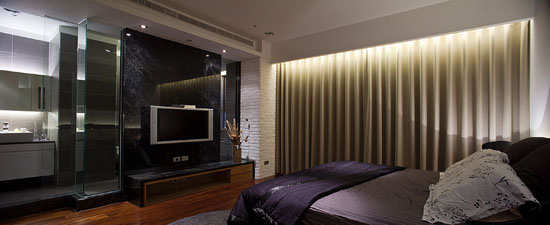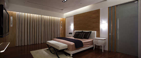 来到净白简约的长男房,深紫色寝具搭配纹理更见斑斓的黑色蓝卡多大理石电视墙,营造出属于成熟男人的现代深沈风格,间或点缀搭配的橡木集层设计,调和场域里过度的都会利落感,而藏于角落的文化石边柱,更画龙点睛呈现适度的人文自然;在喜爱实木质感的主卧房里,一反长男房的比重分配,设计师让层次分明的的深浅集层实木满布,而缀点在白色展示柜后方的日本壁纸,则是现代利落的调和重点,藉由精准拿捏的比例调整,相同的元素营造风格独具的不同场域。