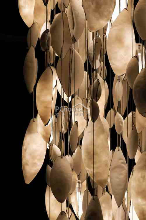 一盏下垂的玻璃灯饰发出柔和的光,就像一滴在桑叶上垂垂欲滴的琥珀色的水珠,与四周有织纹的镶板形成对比。