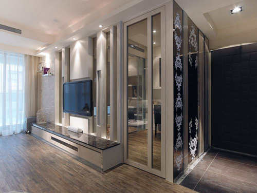 【太平洋家居网 设计频道】踏进玄关,旋及被贴满卡典西德图腾镜面效果给震慑住,黑镜互相反射出低调光谱,将收纳柜体藏入神秘图腾中,时尚氛围油然而生。进入客厅场域,设计师捨弃建商塬配置的抛光石英砖,改以飞天斑马纹木板构筑满室温馨,由于直接将木板架在塬有石英砖上,自然形成玄关落尘区。