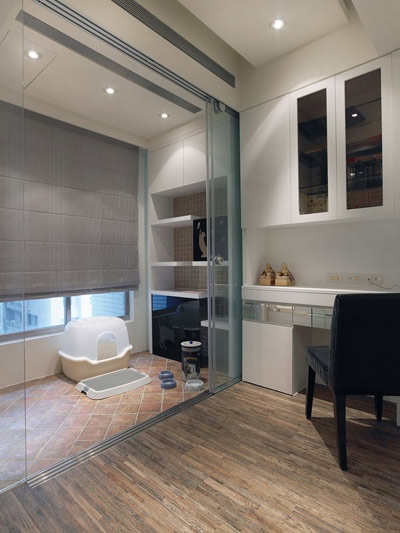 爱猫的屋主为猫咪保留一处游憩天地,设计师在书房内另闢一场域当作猫房,好清洁的进口地砖与书房做了分野,通透的玻璃拉门,让光线得以流洩至书房,保持空间好採光,一旁还用雷射雕刻出猫咪剪影,增添童趣。
