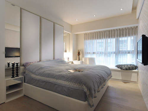 主卧房简单素雅,大片窗檯下架高形成卧榻区,坐卧在上,享受悠閒时光;床头以白色绷布绷出简约风格,两旁以对称镜面做出床头矮柜,衣柜则是白色烤漆搭配明镜线条,两者共筑明亮视野。