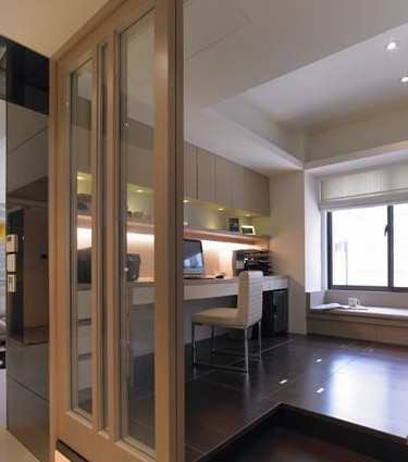 詹设计师在公共领域的天花板特别着墨,运用两段式渐层的效果,虚化空调室内主机和压梁的双重问题,增添层次后减少突兀的落差,在视觉上更觉空间协调、有型。架高的书房空间,除了区隔场域外足足有35公分高的空间可以收纳,不论是地板、座柜下方或是柜体,皆贴心兼顾实用功能及美观。